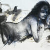 This artwork feels quiet, intimate, and deeply reflective. A woman reclines gently, her body relaxed yet her thoughts seemingly far away. Resting her head against her hand, she appears lost in a private moment — somewhere between memory and imagination. There’s a softness in her expression, almost as if time has slowed down around her.