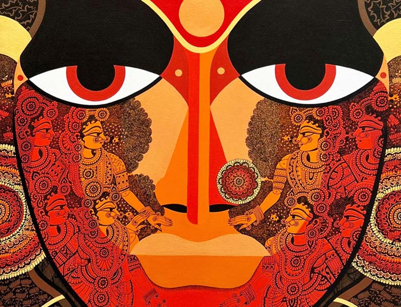 The known episodes and anecdotes from Mahabharata and Ramayana unfold to the viewers gradually in the paintings. He aptly arranges a huge portrait of one’ nayak’ in the centre of the composition and then creatively adorns him as well his surrounding sections with excerpts picked up from the characters contribution in taking story line of the popular epic ahead. The linear rhythm of the ‘thollu bommalata ‘gets recreated in his paintings and sculptures. The “Line” intricate and lyrical, bold and sensitive carves out the silhouettes of the figures and then turns inside the form to define the details in a specifically aesthetic and creative manner. The features of the characters are sharp, defined and finely chiseled. The huge, soulful, almond shaped eyes are the most prominent feature of the portraits. The line boldly yet lyrically runs over the coloured areas and while doing so it connects the different colour planes into a single entity, weaving them together with intricate patterns, floral clusters, motifs and suggestive jewelry.