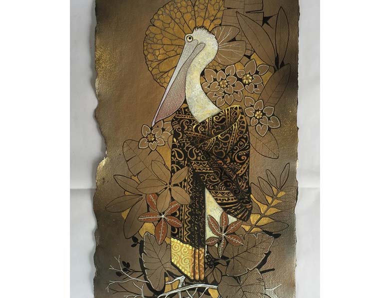 Ganapati Hegde paints half-real, half-imagined worlds, layered with fantastical and unexpected elements that depict the rapturously green and radiant landscape of North Karnataka’s coast where he grew up. Hegde’s otherworldly jungle is full of interesting minutiae, and is inhabited by nature’s assorted residents, from caterpillars and chameleons to monkeys and butterflies, alongside a profusion of foliage painted in bright blues, reds, greens and lavenders. Amidst the lushness of Hegde’s vibrant acrylic and oil canvases sit sly anthropomorphic animals and familiar urban objects, including laptops, flags and furniture. While nature and its furry, feathery, and floral protagonists remain centre stage, an undercurrent of fable-like storytelling and sharp wit ripples through his work, compelling viewers to dig beneath the thicket of indigenous plants, flowers, birds, animals and insects.