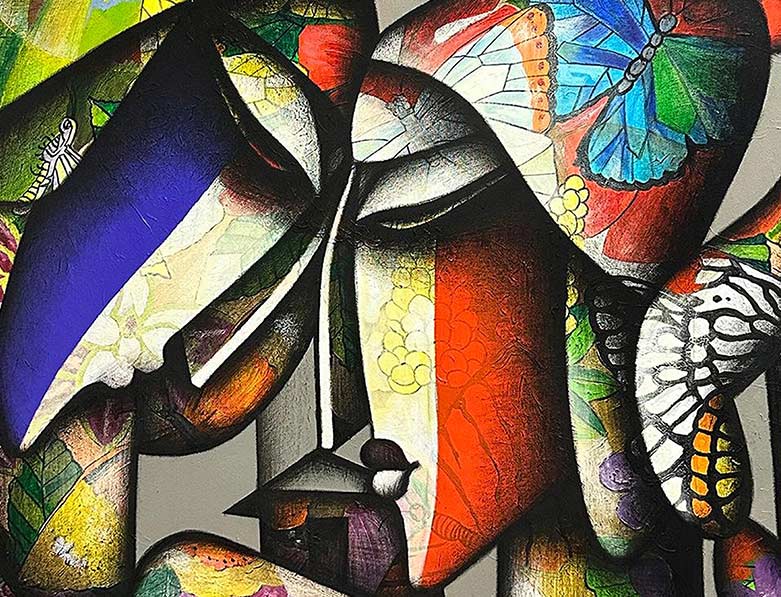 Jagannath Paul is deeply influenced by Cubist art form of post-modern era. Unlike other artists, who prefer curvy, realistic lines to draw their subjects, Jagannath paints them with straight lines. Their noses are long, lips are plump and eyes closed. The closed eyes in these paintings might be representing numerous things; deeply engaged in thoughts, lost in a dream, enjoying the pleasures of physical world, or even self-reflection.