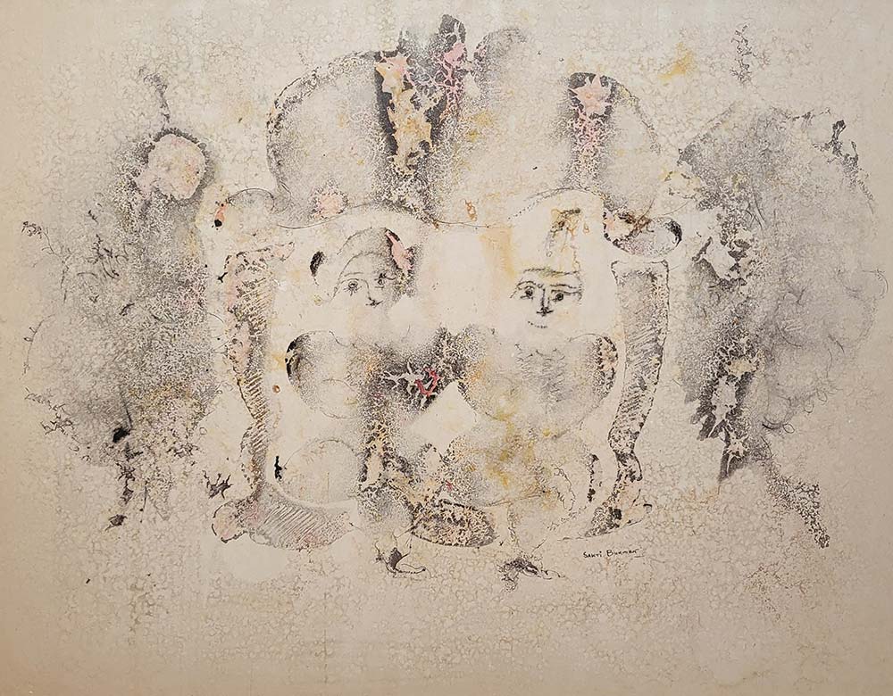 Pointillism and a marbling effect are unique characteristics of Burman’s art. He discovered marbling accidentally when water spilled on an oil canvas caused a filigreed dispersal of oil, an effect he has been painstakingly recreating ever since. Incredibly, he brought the same effect to his prints, made in his initial years, achieving the marbling on the surface of the medium — stone or wood or metal — through a labourious technical process in close collaboration with his printmakers, incidentally, also employed by Pablo Picasso and Marc Chagall. In 1958, exposure to Italian Renaissance frescos by Giotto, Piero della Francesca and Simone Martini inspired Burman to incorporate the monumentality and texture of their works in his oeuvre.