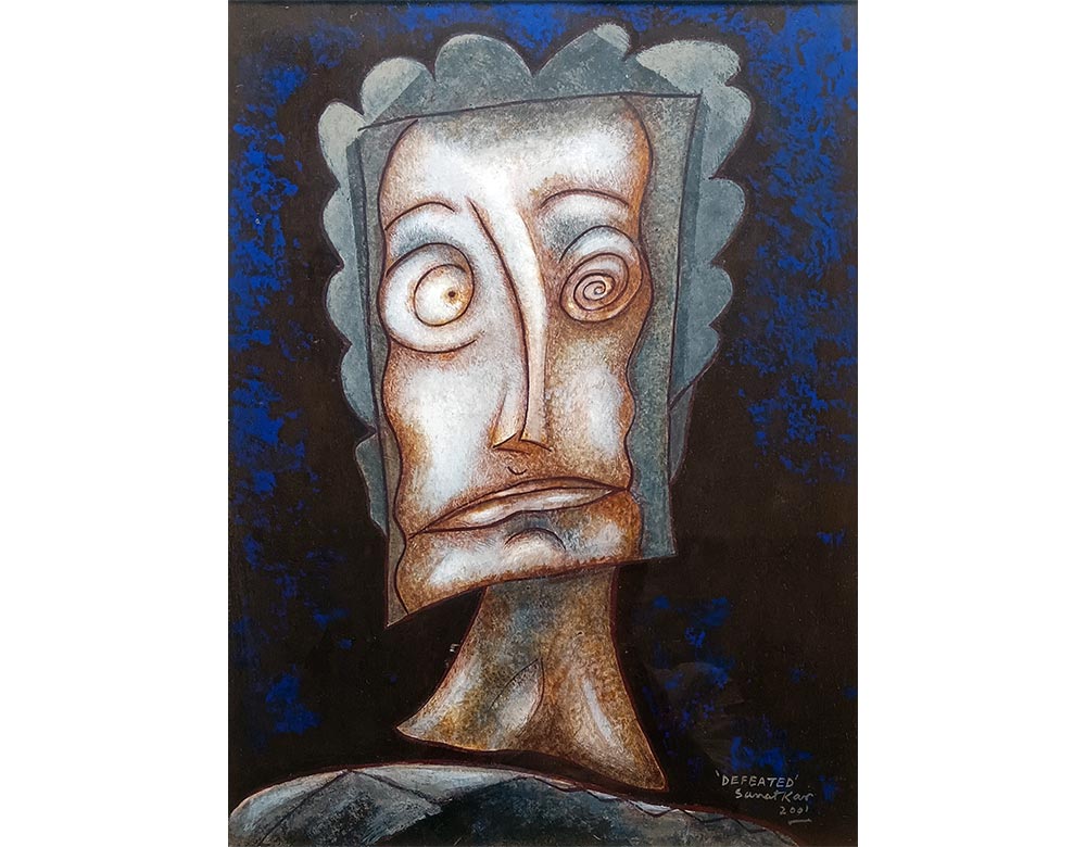 While his earliest works, such as Dreams, Ikebana, Leaves and Maya, show the artist’s interest in nature and fantasy, he has explored the language of reverie in most of his works. Unlike many of his contemporaries who engaged in a stark depiction of social realism, Kar’s vocabulary of dreams has had as much social relevance as an image pitched towards revolutionary change. Nevertheless, some of his earlier works in oil are located on the edge of formal play and social comment. Throughout, however, the core sentiment of his chosen subject has remained dark, brooding, and sombre, processing the cycle of life.